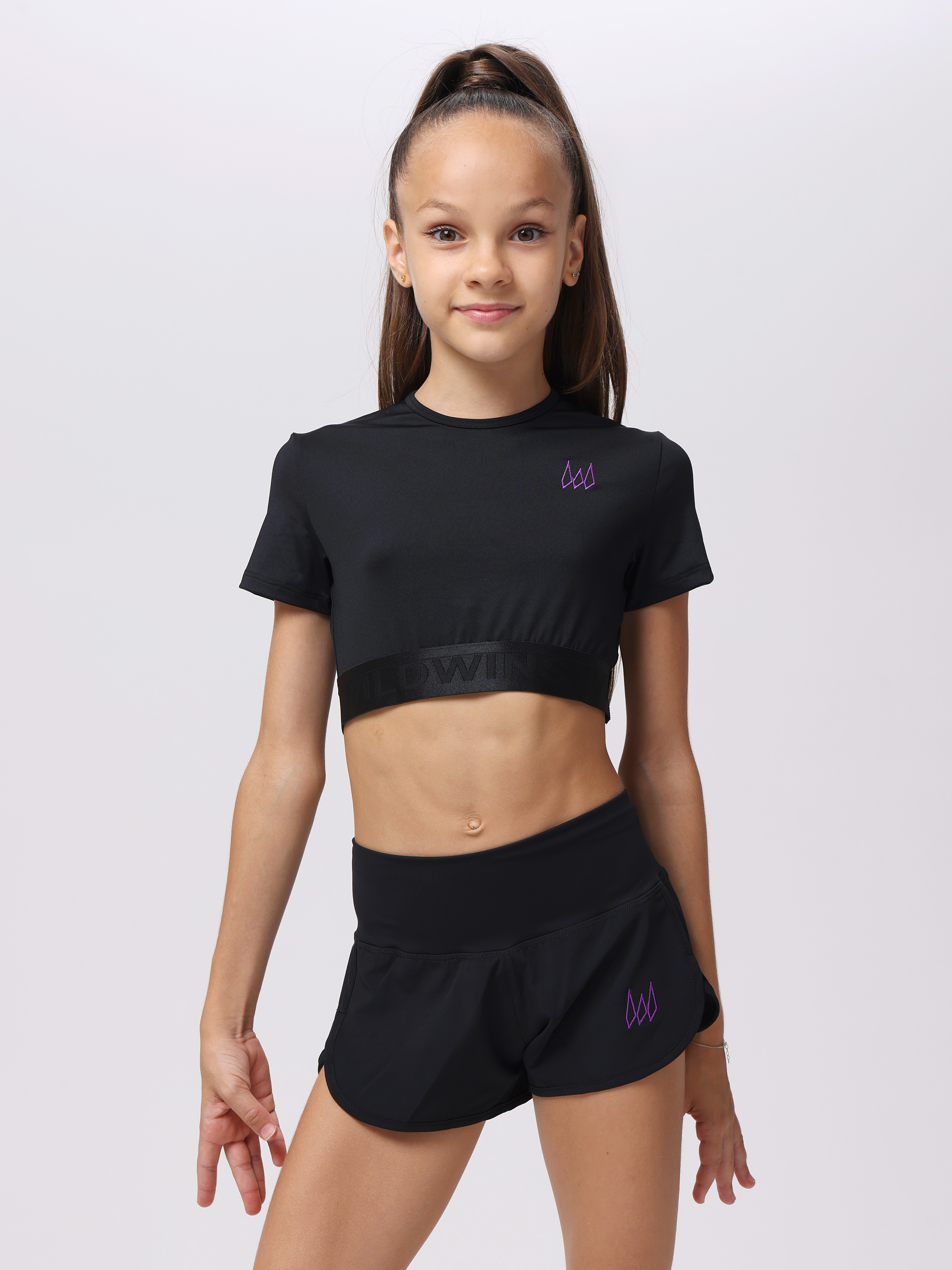Спортивный топ для девочки из коллекции Гран При, с коротким рукавом. Лого фиолетового цвета.